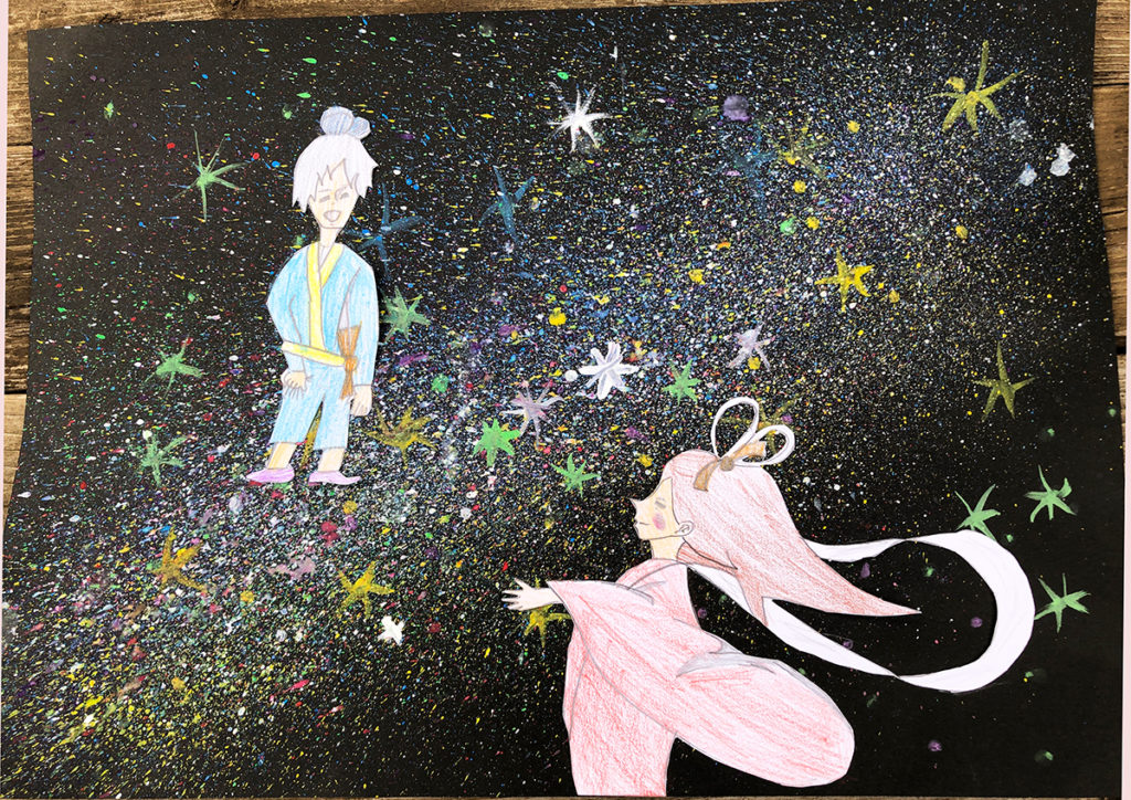 織姫と彦星 投稿日: 2023年7月9日2023年12月23日 投稿者: Yukio Kaoru こんにちは。こまこまアートです。先日は七夕でしたね。 短冊にお願いごとは書きましたか?今年は珍しくお天気も良く、夜空を見上げた方も多かったのではないでしょうか。こまこまアートも「七夕」テーマに天の川を描きました。星は歯ブラシを使って描いています。 織姫と彦星は無事に出会えたかな〜?夏の夜空に願いを込めて。