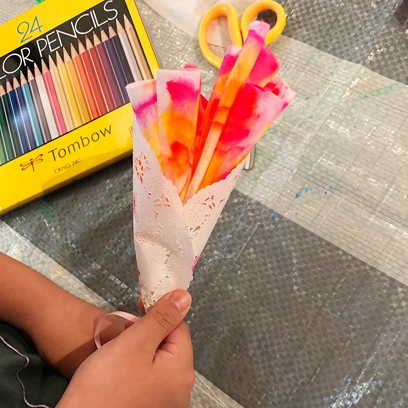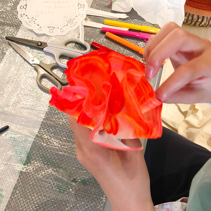 コーヒーフィルターにペンテルの水性ペンで色を付けた後、