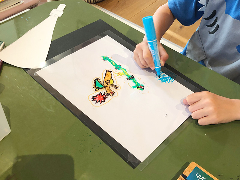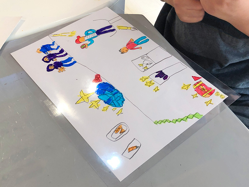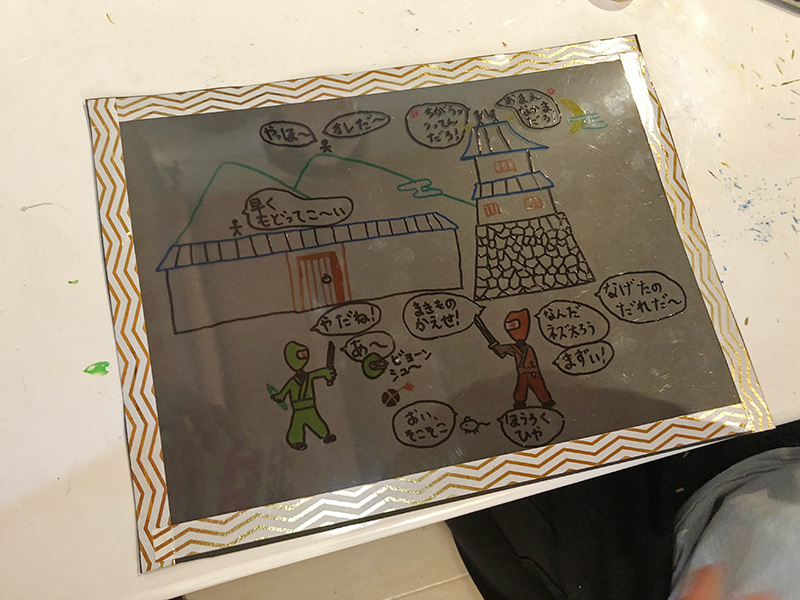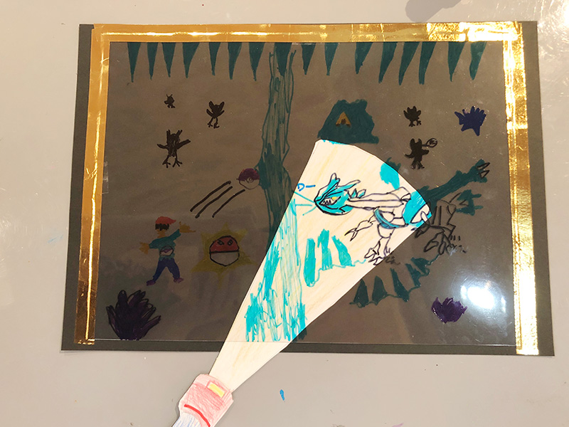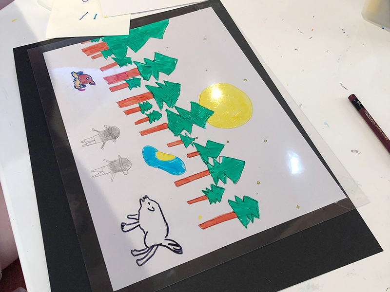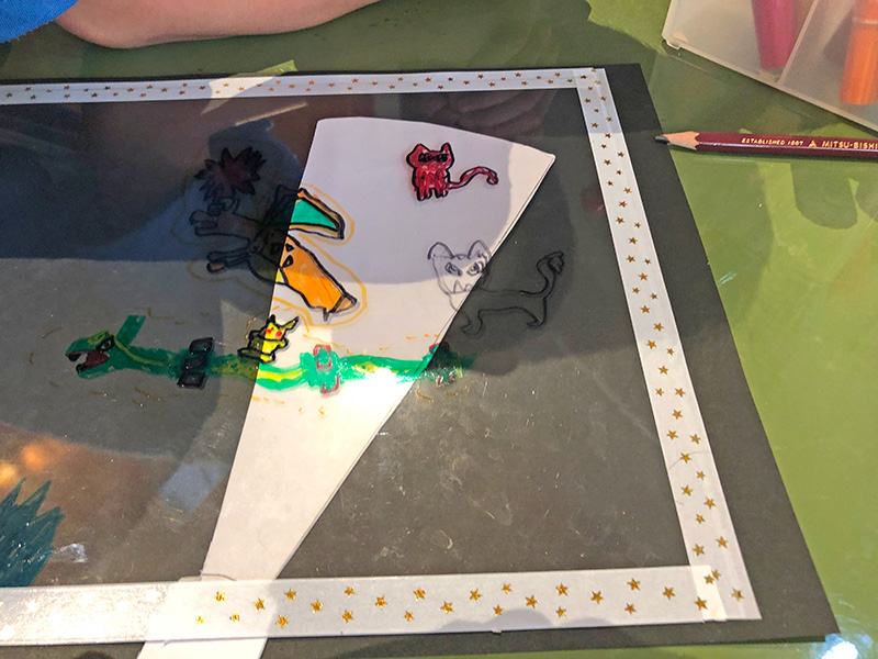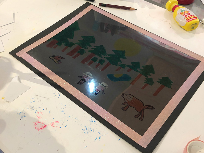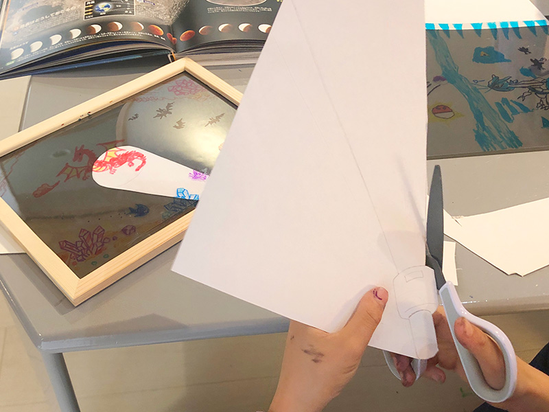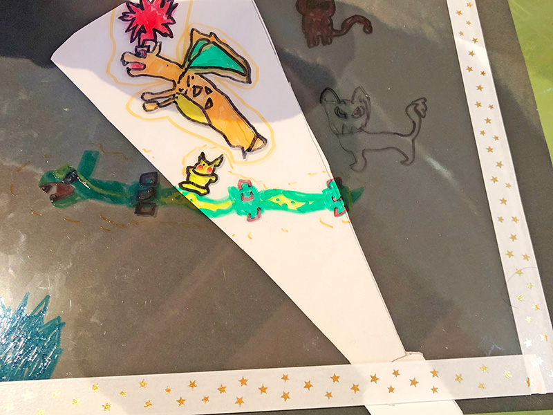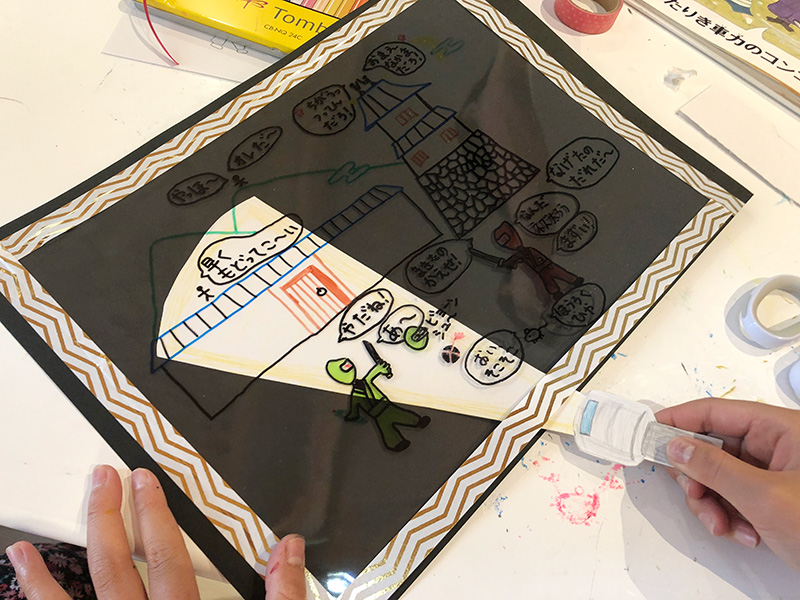 下書きの白い紙を抜き、フィルムを黒い画用紙にテープで止めます。