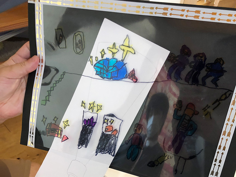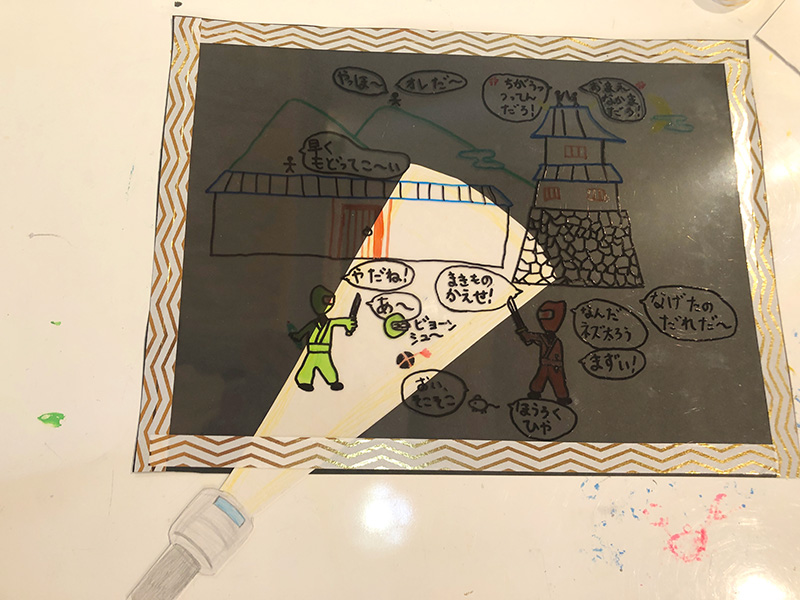 ライトを動かすと絵の中のいろんな部分を照らせる、楽しい作品です。
