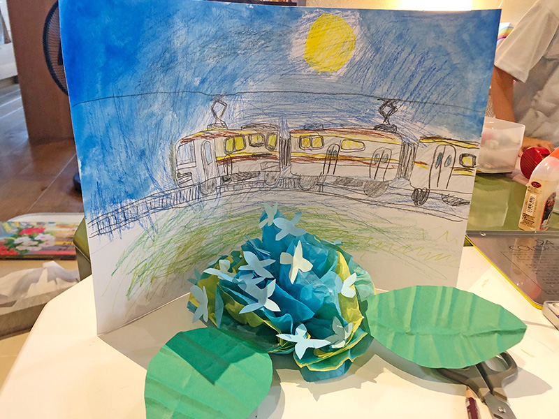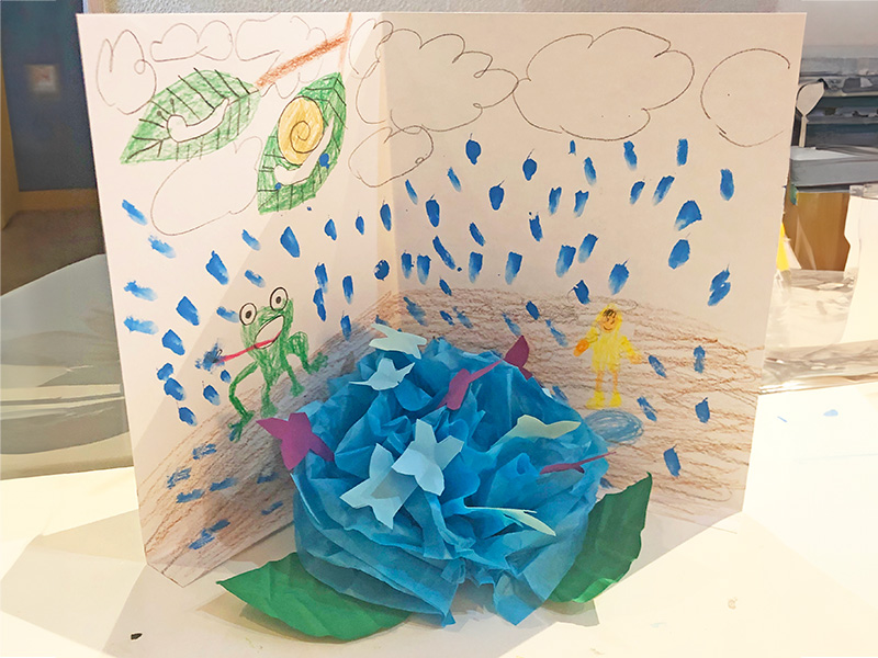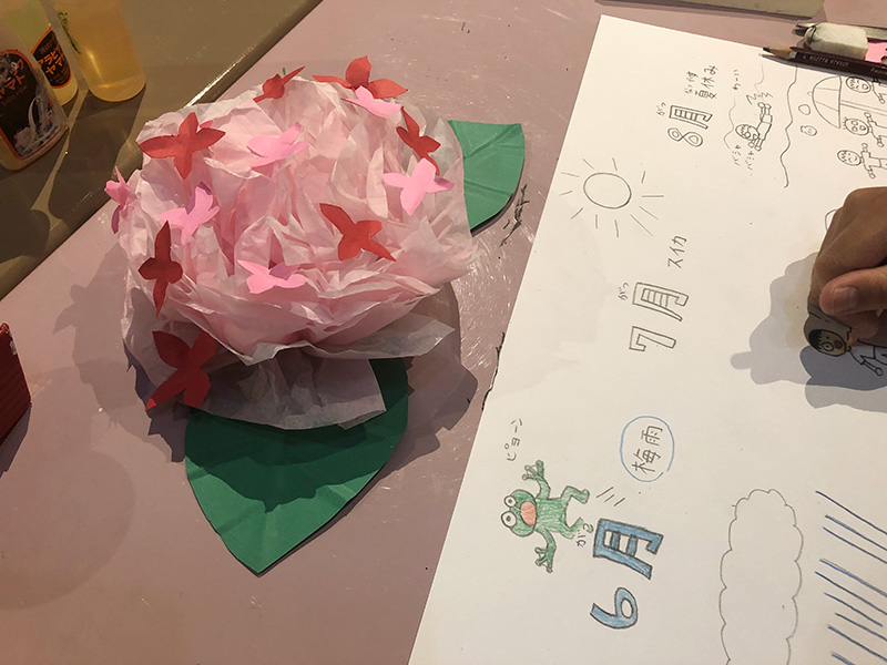 梅雨と紫陽花 投稿日: 2024年7月23日2024年7月24日 投稿者: Yukio Kaoru こんにちは。こまこまアートです。シトシト雨の続く梅雨の季節には、「お絵描きと工作」でしっとり優しい作品を作りました。 お花紙と画用紙を使って紫陽花を作り、画用紙に絵で背景を描いていきます。 幻想的な作品、晴れ間の嬉しさを感じる作品、ユーモラスな作品。みんなとても素敵な作品ができました!