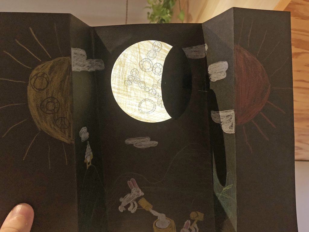 観音開きに折られた黒紙を開くと月が現れる、という仕掛け工作でした。