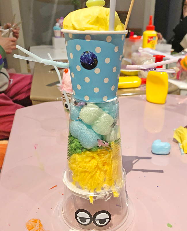 材料は毛糸、紙コップ、お花紙、ビーズ、そして100円ショップで手に入れた発泡スチロール、ポンポンなど♪