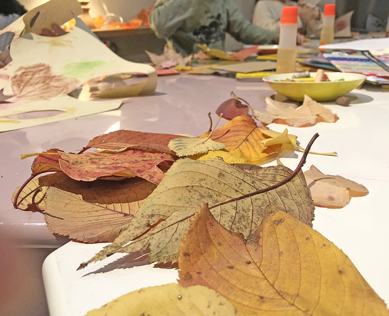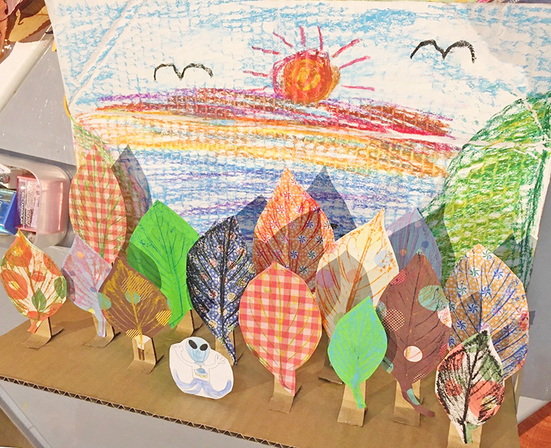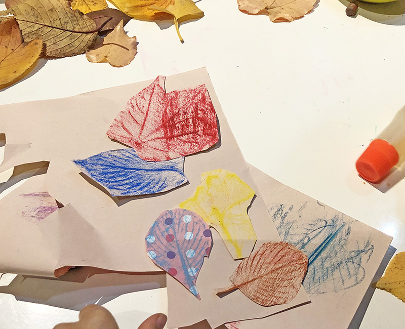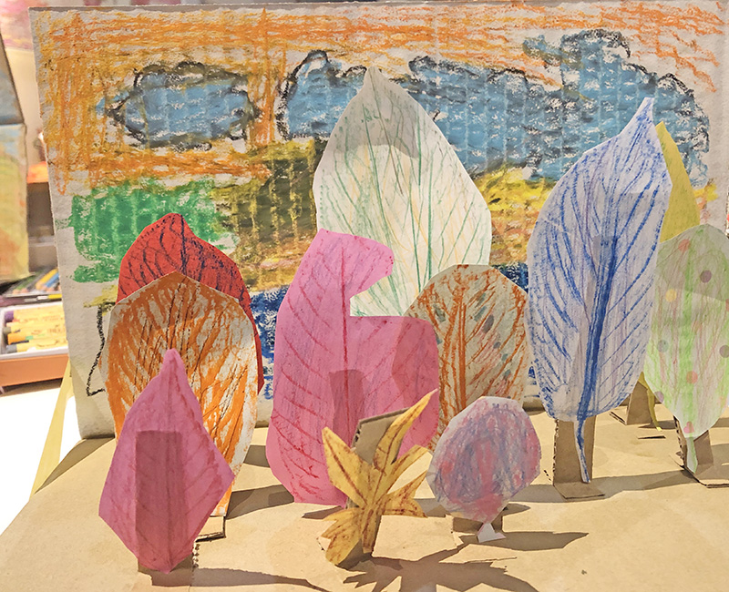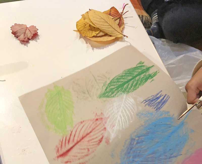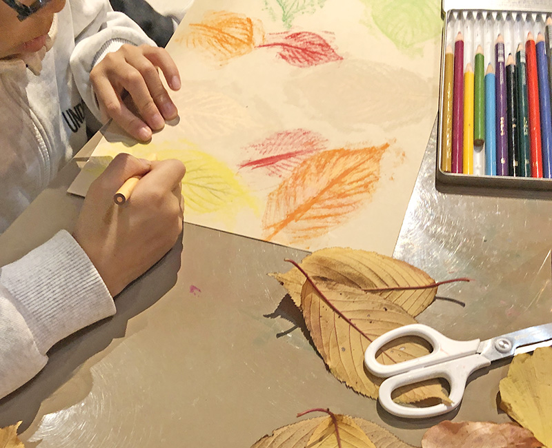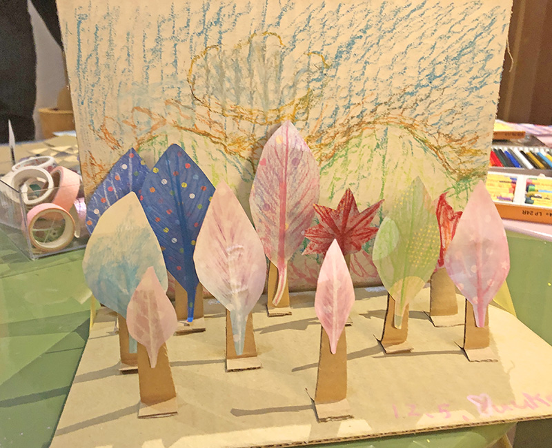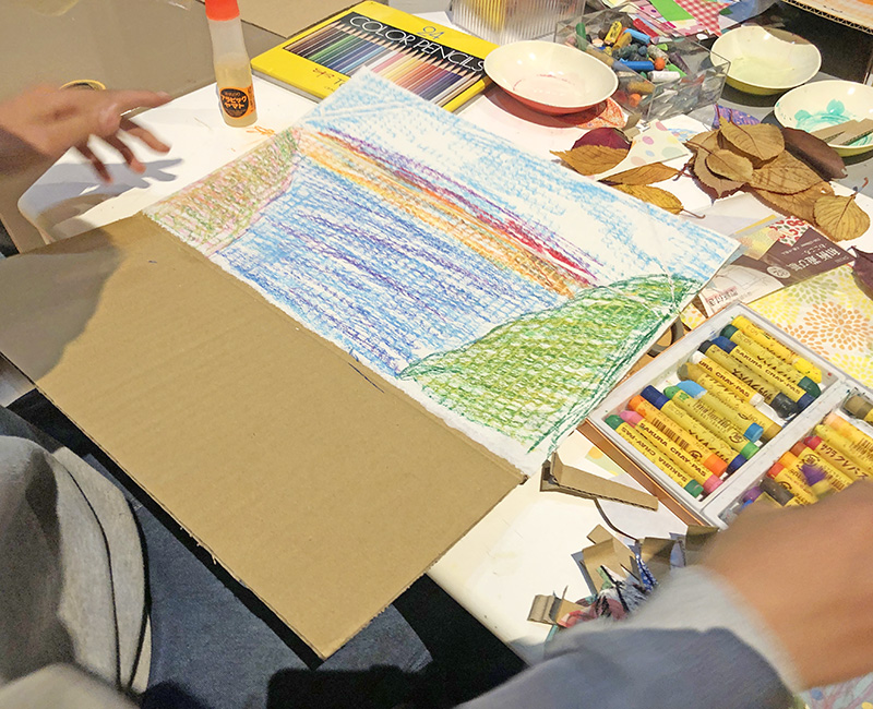 こんにちは。こまこまアートです。フロッタージュの技法を使い、秋の森を使いました。