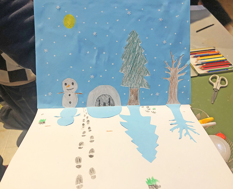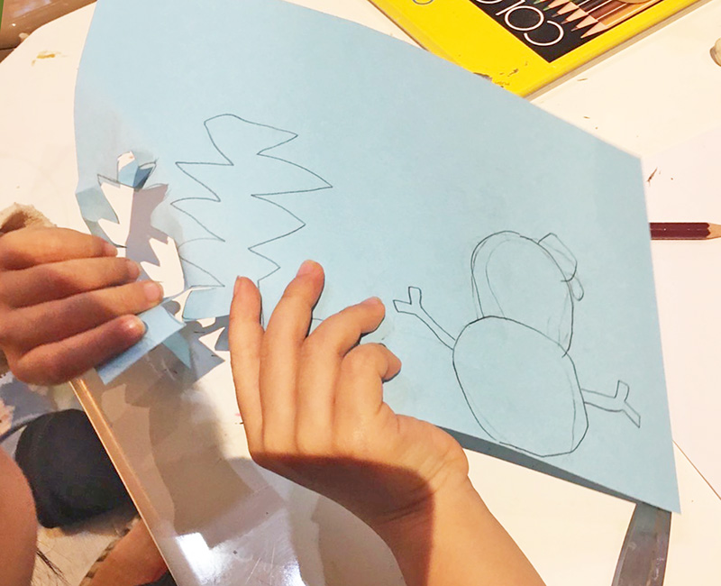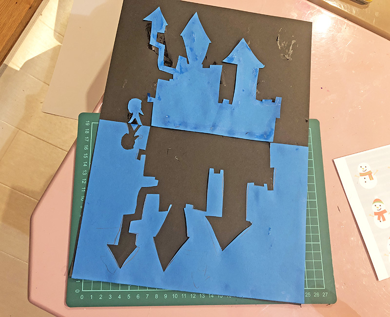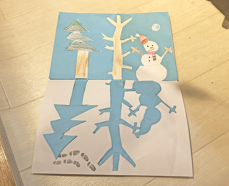 木や雪だるまのシルエットを描いて、切って、白い画用紙にそれぞれ貼れば・・・。