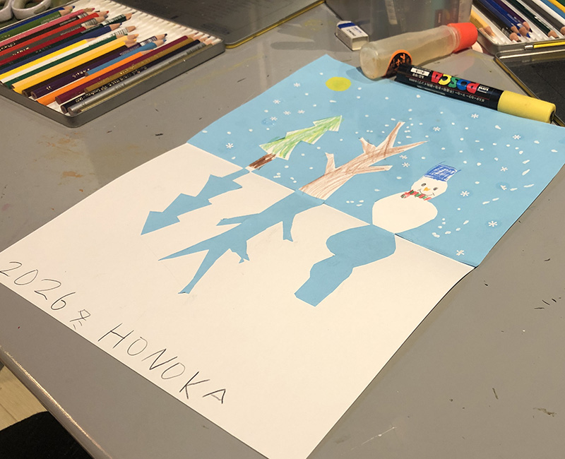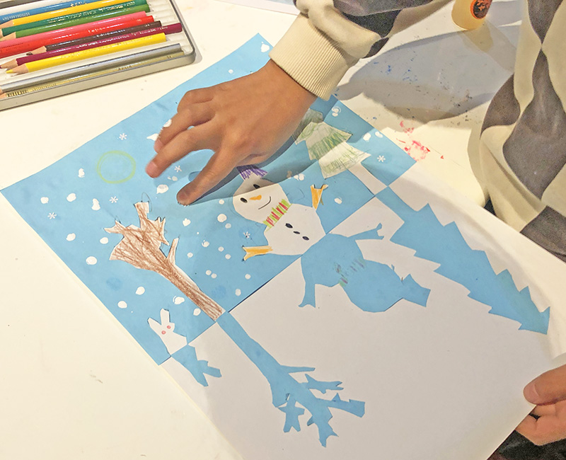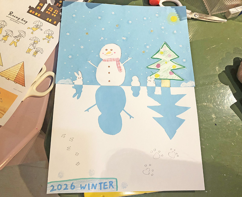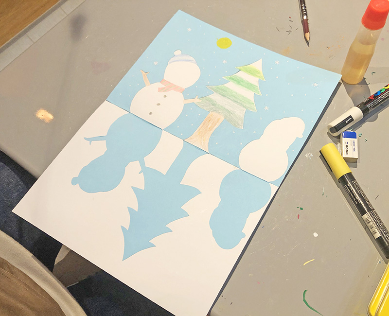 雪だるまにお顔を描いたり、雪を描いたりして完成です♪